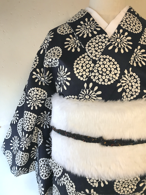 寒い時期ならではの、モフモフフェイクファーのつくり帯です。