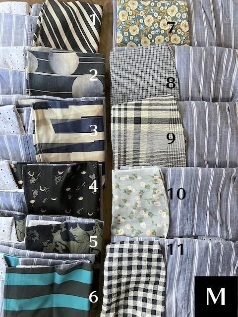 綿麻、薄手のローン生地、ブルーを基調とした白と緑のストライプ。