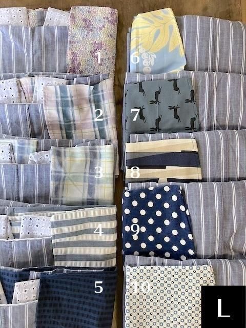 綿麻、薄手のローン生地、ブルーを基調とした白と緑のストライプ。