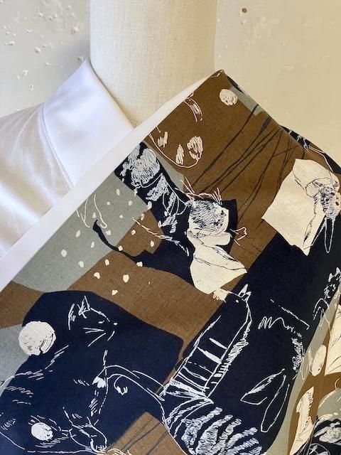 茶色、ネイビー、セージ、キナリの幾何学模様?の合間に