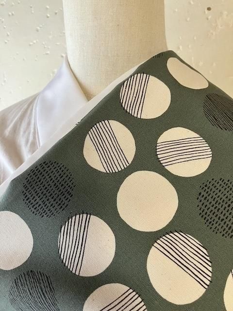 深めの少しくすみグリーンに、白まると、焦茶の点と線。